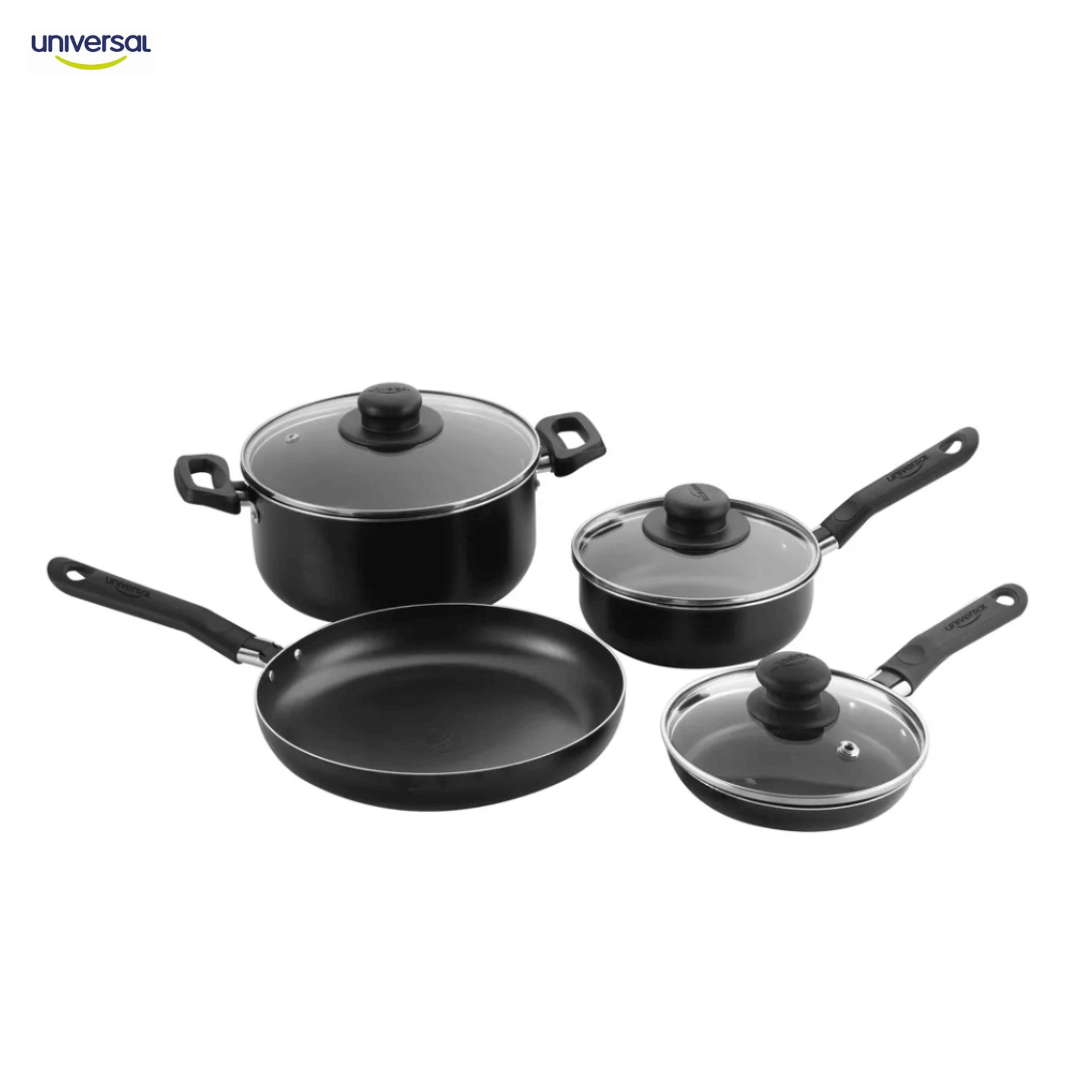 BATERIA 7 PIEZAS UNIVERSAL L39457; Con dimensiones de olla de 24 cm: 4.1L, cacerola de 16 cm: 0.5L, sartén de 24 cm: 1.5L, perol de 16 cm: 1.1L, Tapa de Vidrio nos permiten hacer diferentes recetas para compartirlas en familia y con amigos, con base antiadherente permiten una cocción mas saludable y bajas en grasa, del mismo modo, debido al fondo grafilado, disfrutarás de una mayor estabilidad al cocinar y una distribución uniforme del calor en la base, asegurando resultados perfectamente cocidos.