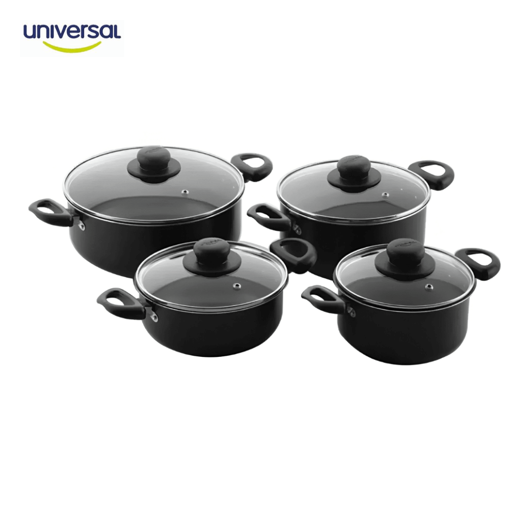 BATERÍA 8 PIEZAS SOLO OLLAS UNIVERSAL L39343; Dimensiones generales del set: 30.5 cm de alto, 44 cm de ancho y 26.5 cm de largo, en color negro, marca Universal. Incluye ollas de 24 cm, 20 cm, 18 cm y 16 cm, todas con tapa. set compuesto por 4 ollas con tapas de vidrio templado, ideales para preparar todo tipo de recetas con eficiencia y seguridad. Fabricadas en aluminio con recubrimiento antiadherente de 4 capas y pintura exterior metalizada, garantizan una excelente distribución del calor y fácil limpieza. Cada olla cuenta con asas en baquelita resistente al calor y fondo grafilado antideslizante para mayor estabilidad,