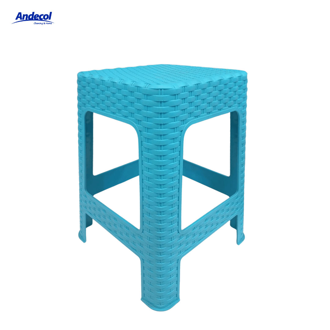BUTACO TIPO RATTAN AZUL HORTENCIA ANDECOL; butaco individual de diseño tipo rattan fabricado en plástico resistente de alta durabilidad, con dimensiones de 46 cm de alto, 36 cm de ancho y 36 cm de largo,marca Andecol. Cuenta con 1 nivel de asiento diseñado para 1 persona, soportando una capacidad de carga hasta 80 kg, lo que garantiza estabilidad y seguridad en el uso diario. Es un producto portátil, liviano y fácil de trasladar, no plegable ni desarmable. Su material plástico tipo rattan ofrece resistencia al uso frecuente y fácil limpieza. Ideal para utilizar en cocina, baño, lavandería, patio o espacios interiores, recomendado para sentarse en superficies planas y secas, evitando sobrecargas para prolongar su vida útil y mantener su estructura firme y funcional.