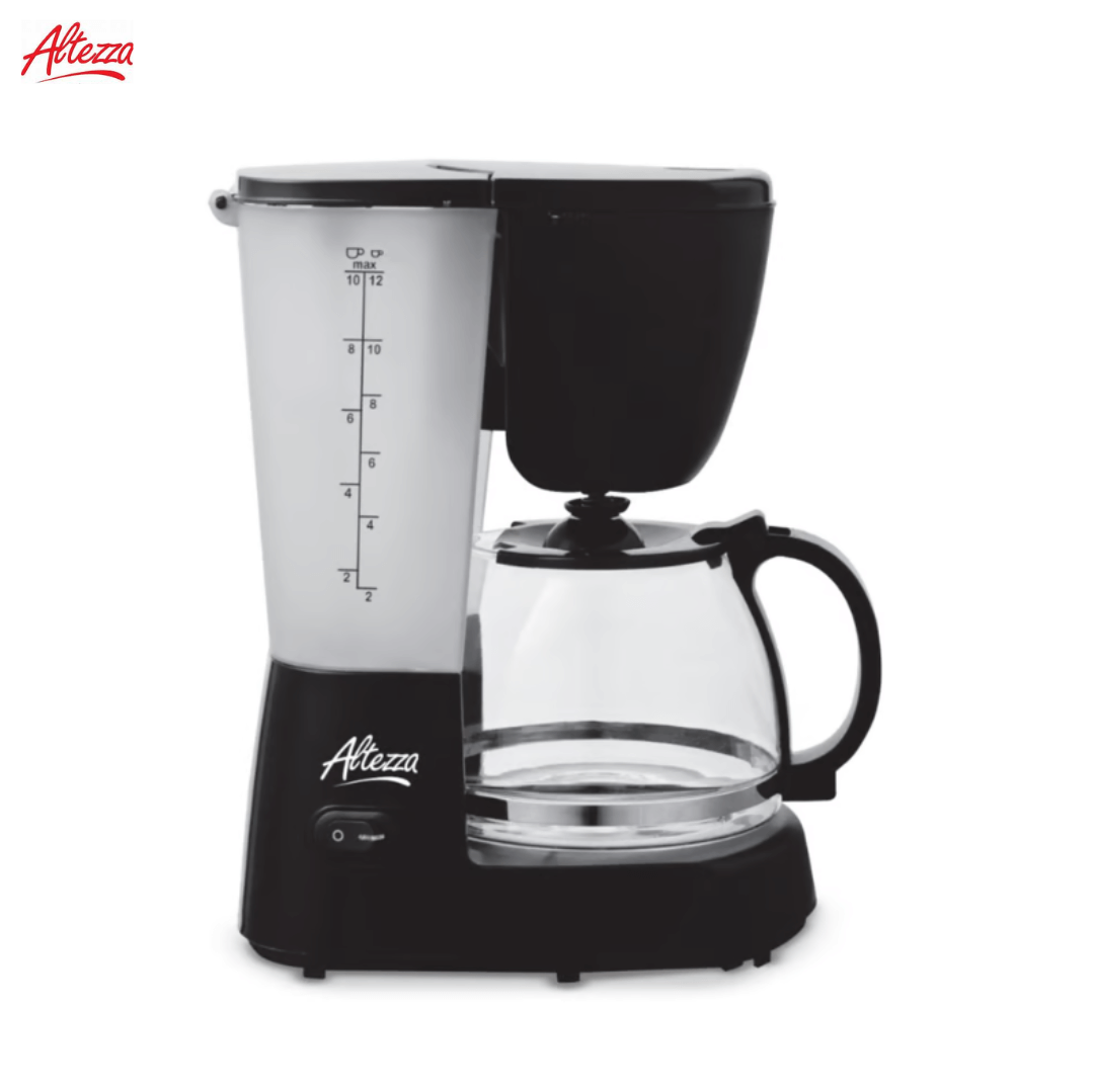 CAFETERA ELECTRICA ALTEZZA NEGRA 12 TZS ACM-5309BL COD 95522; cafetera eléctrica portátil en color negro, fabricada en plástico resistente con jarra de vidrio templado, con dimensiones aproximadas de 16 cm de ancho, 23 cm de largo y 31 cm de alto. Cuenta con un depósito graduado, filtro removible y lavable, sistema antigoteo y calentamiento automático para mantener el café caliente. Su capacidad es de 10 a 12 tazas, ideal para uso doméstico o en oficinas. Incluye botón LED de encendido/apagado y cuchara medidora. Perfecta para ubicar en la cocina o zona de bebidas, permitiendo preparar café de manera rápida, limpia y segura gracias a su funcionamiento eléctrico y materiales de fácil mantenimiento.