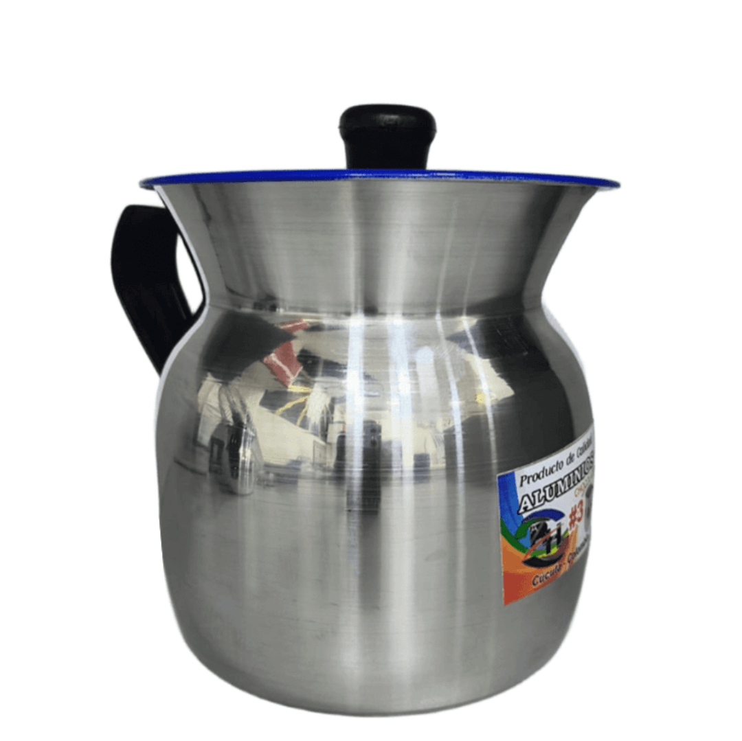 JARRA CHOCOLATERA 3 TAPA COLOR ALUMINIOS RH; Jarra chocolatera #3 con tapa color aluminio RH, fabricada en aluminio resistente y liviano, con dimensiones aproximadas de 15 cm de alto, 14 cm de ancho y 14 cm de largo. Incluye tapa ajustada con borde color azul para conservar mejor el calor y asa ergonómica en aluminio con capa de pintura negra que facilita un agarre seguro durante el manejo. Posee una sola cavidad de preparación y ideal para calentar o servir bebidas calientes como chocolate o atole. Tipo de producto portátil, de fácil