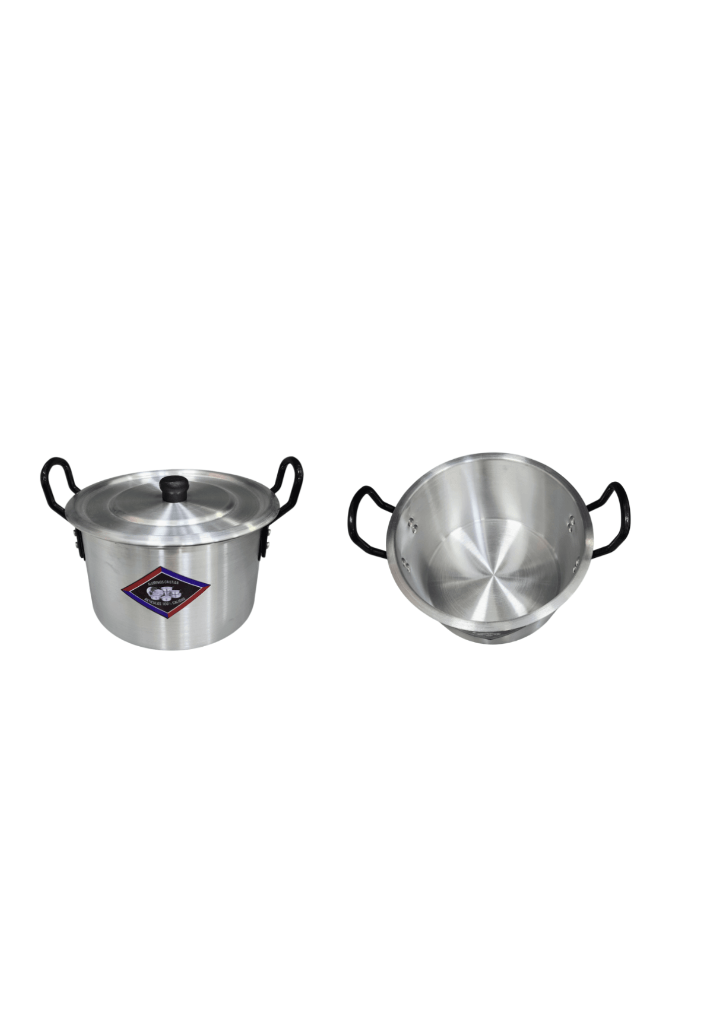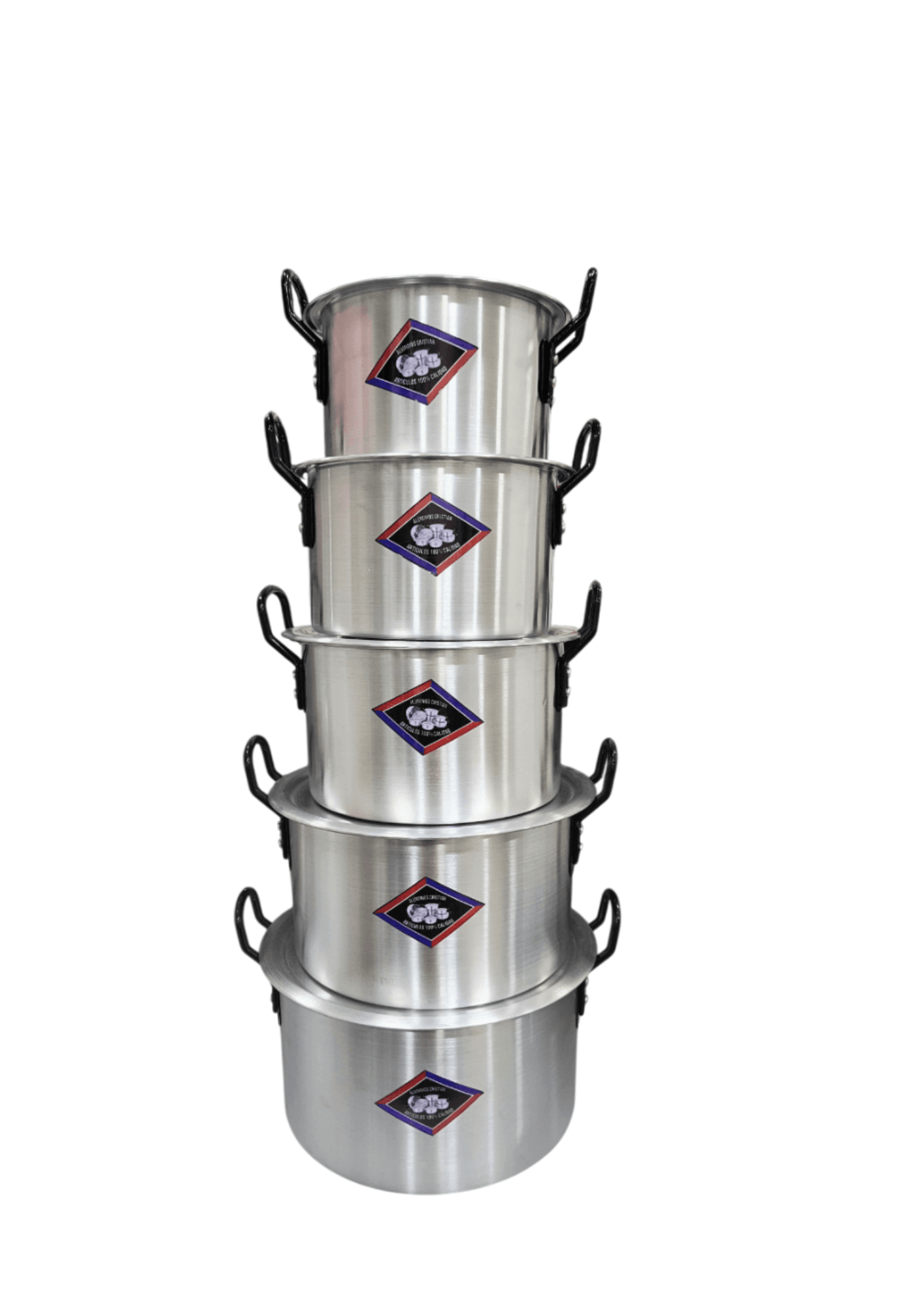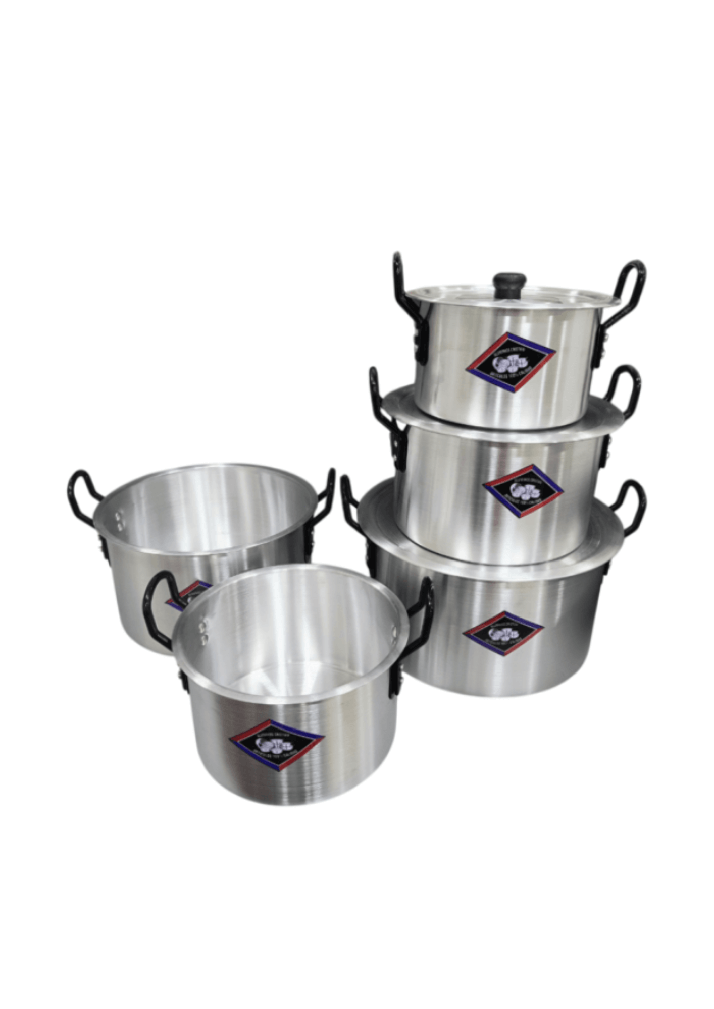 JUEGO DE CALDERO 14-22 TAPA PULIDA CR REFORZADO; set de 5, Calderos elaborados en aluminio reforzado con acabado pulido tipo espejo que mejora su durabilidad y facilita la limpieza. Incluye tamaños de 14, ,16, 18, 20, 22, cm de diámetro, con tapas ajustadas que permiten una cocción uniforme y controlada. Sus asas laterales de baquelita ofrecen agarre firme y aislamiento térmico. De color plateado con detalles negros, marca CR, Ideal para uso doméstico o profesional en cocina.