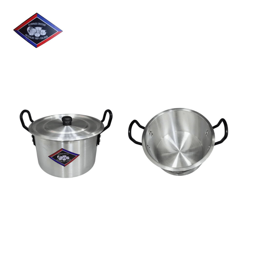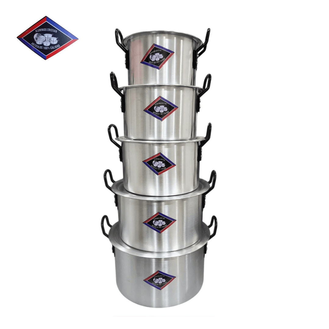 set de 5 calderos elaborados en aluminio fundiddo con acabado pulido tipo espejo que mejora su durabilidad y facilita la limpieza. Incluye tamaños de 16, 18, 20, 22 y 24 cm de diámetro, con tapas ajustadas que permiten una cocción uniforme y controlada. Sus asas laterales de baquelita ofrecen agarre firme y aislamiento térmico. De color plateado con detalles negros, marca CR, peso total aproximado de 1.6 kg y dimensiones del empaque 25 cm de alto, 30 cm de ancho y 26 cm de largo. Ideal para uso doméstico o profesional en cocina, apto para preparar desde sopas hasta guisos. Se recomienda lavar con esponja suave y jabón neutro, evitando productos abrasivos para conservar su brillo y vida útil.