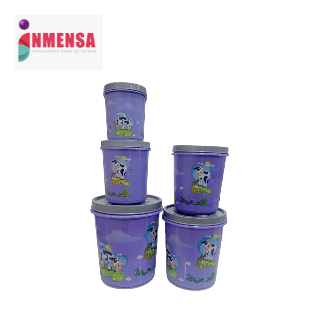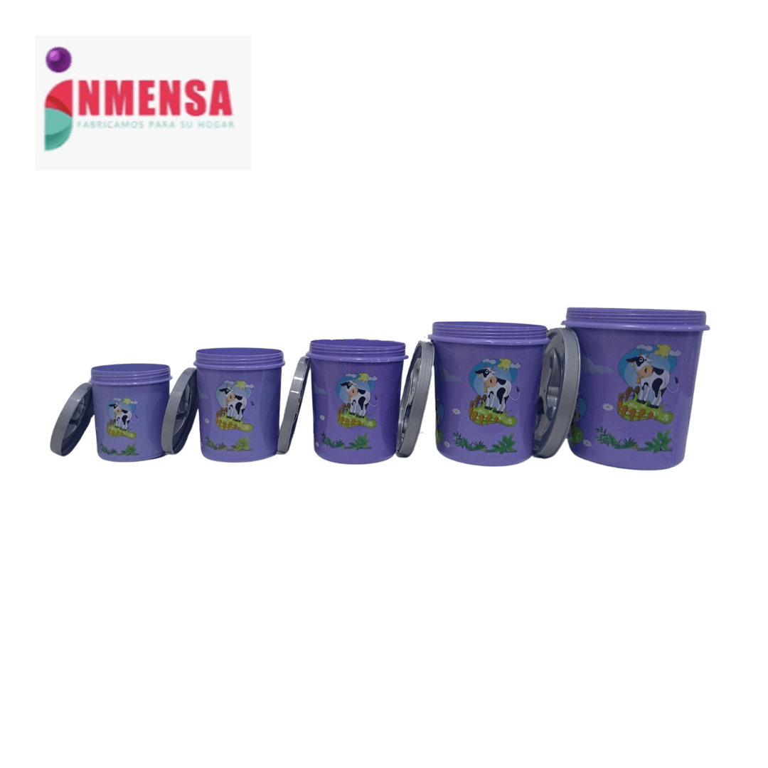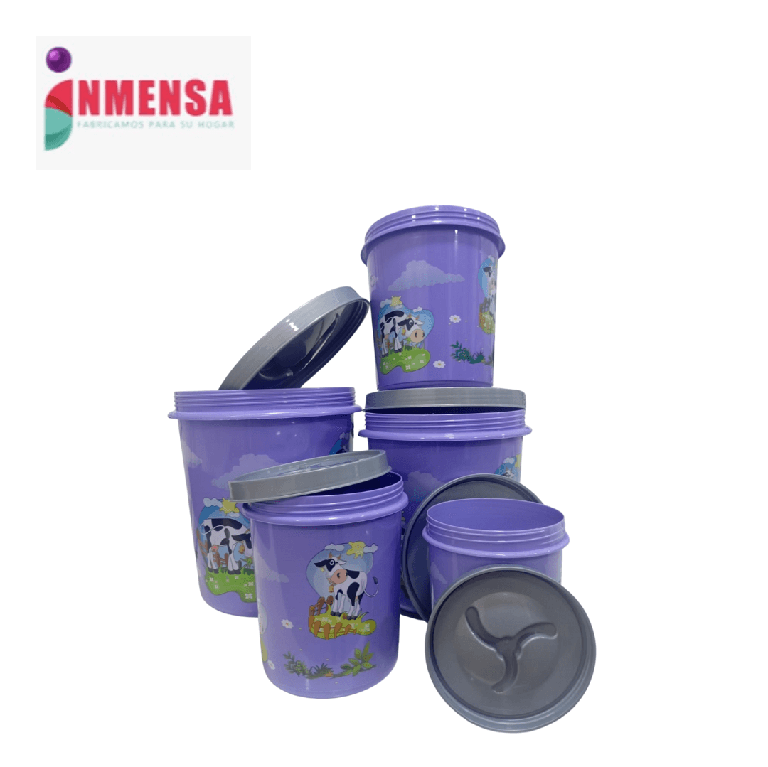 JUEGO DE TARROS TWIST MILAN X 5 ECO DECORADO INMENSA REF: F91106 Combo Twist Milán X5Decorado, set ideal para mantener tus alimentos organizados y frescos. Incluye cinco tarros herméticos de diferentes capacidades desde el 1.5L al 5L, perfectos para guardar cereales, harinas, granos o snacks. Fabricados en material resistente y duradero, garantizan conservación y limpieza prolongada. Su diseño con diversas imágenes decorativas temáticas aporta color y estilo a tu cocina.
