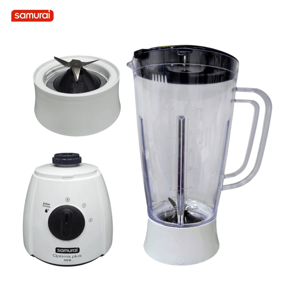 LICUADORA SAMURAI OPTIMIX PLUS BLANCA REF 5861022077; Con dimensiones de 31 cm de alto, 25 cm de ancho y 19 cm de largo, equipada con vaso plástico de alta en policarbonato resistencia y capacidad de 2 litros, ideal para preparar jugos, batidos o salsas con eficiencia. Incorpora motor de 550 W, 2 velocidades y función pulso para ajustar la textura según la preparación. Su sistema de acople en Carbon Drive ofrece una durabilidad dos veces mayor, y sus cuchillas ZELKROM de acero inoxidable mantienen el filo por más tiempo. esta licuadora de color blanco y marca SAMURAI es un electrodoméstico esencial para uso doméstico en cocina, garantizando potencia, practicidad y fácil limpieza.