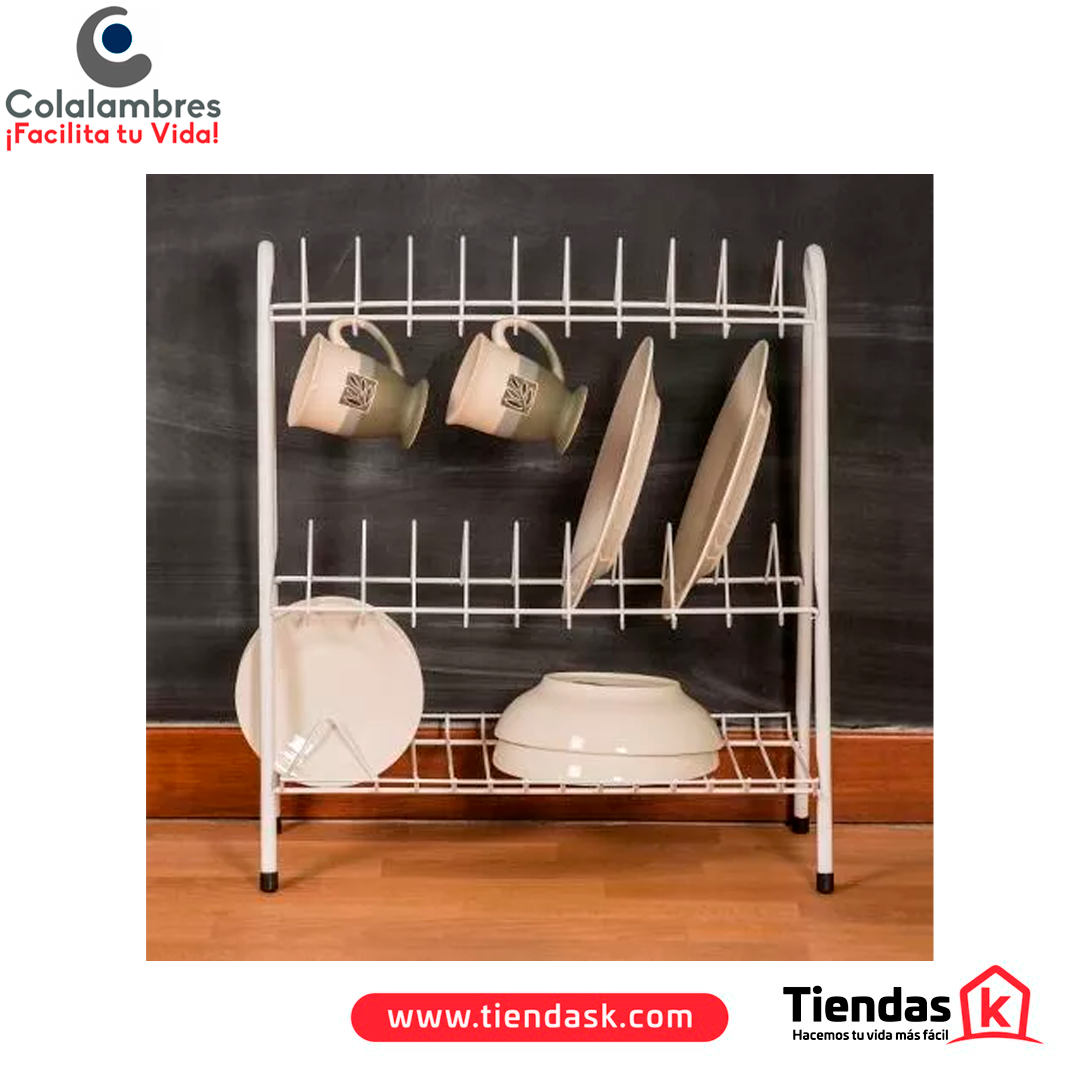 LOCERO DDE TUBO 3 NIVELES COLOR BLANCO REF 009 COLALAMBRES; Sus dimensiones son 55 cm de alto, 53 cm de ancho y 35 cm de largo, con tres niveles que permiten organizar y escurrir hasta 20 platos en la parte superior, además de tazas y cubiertos en los niveles inferiores. elaborado en tubo metálico pintado con recubrimiento resistente a la humedad y la oxidación, ideal para uso en cocina. De tipo fijo y estable, ofrece gran durabilidad y soporte gracias a su estructura reforzada. Su elegante color blanco aporta un toque decorativo y moderno, combinando estilo y funcionalidad para mantener el área de lavado limpia y ordenada con facilidad.