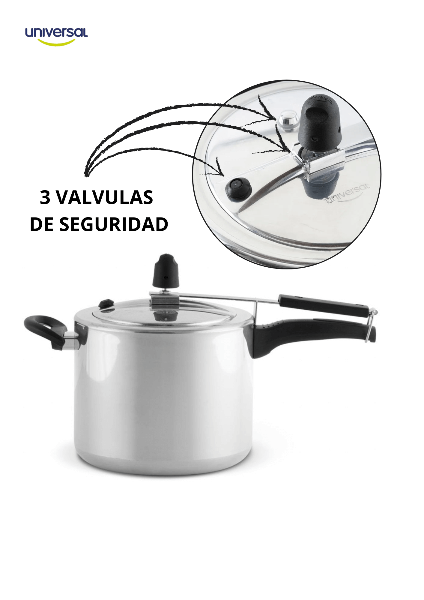 OLLA A PRESION ESENCIAL 6 LITROS UNIVERSAL REF. L24602: fabricada en aluminio reforzado de 2 mm de espesor, diseñada para una cocción rápida, segura y eficiente. Con capacidad de 6 litros, mide 18 cm de alto, 23 cm de ancho y 41 cm de largo, y cuenta con válvula de seguridad que mantiene una presión nominal de 80 kPa para garantizar el funcionamiento óptimo. Su sistema de cierre hermético y autoajustable evita fugas, mientras que el mango en baquelita resistente al calor proporciona un manejo seguro. De color plateado, marca Corona, ideal para uso en cocina doméstica o profesional en la preparación de carnes, granos y sopas.