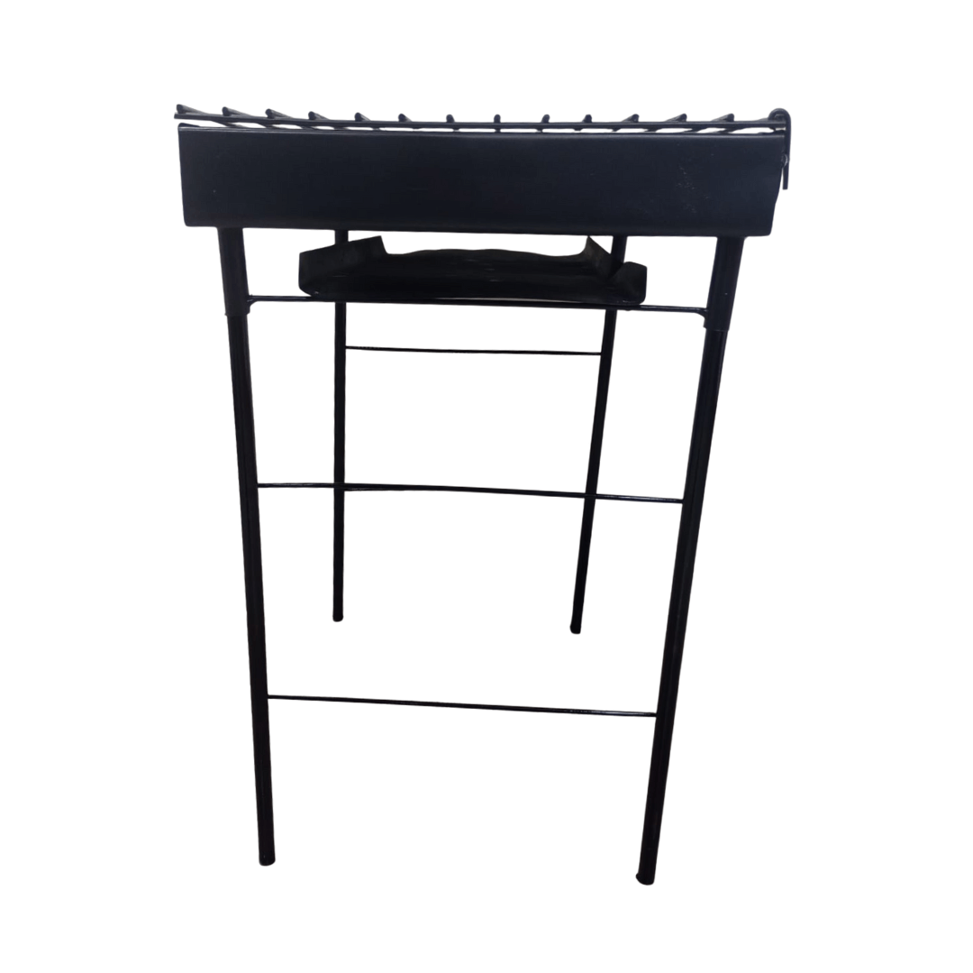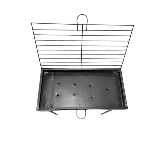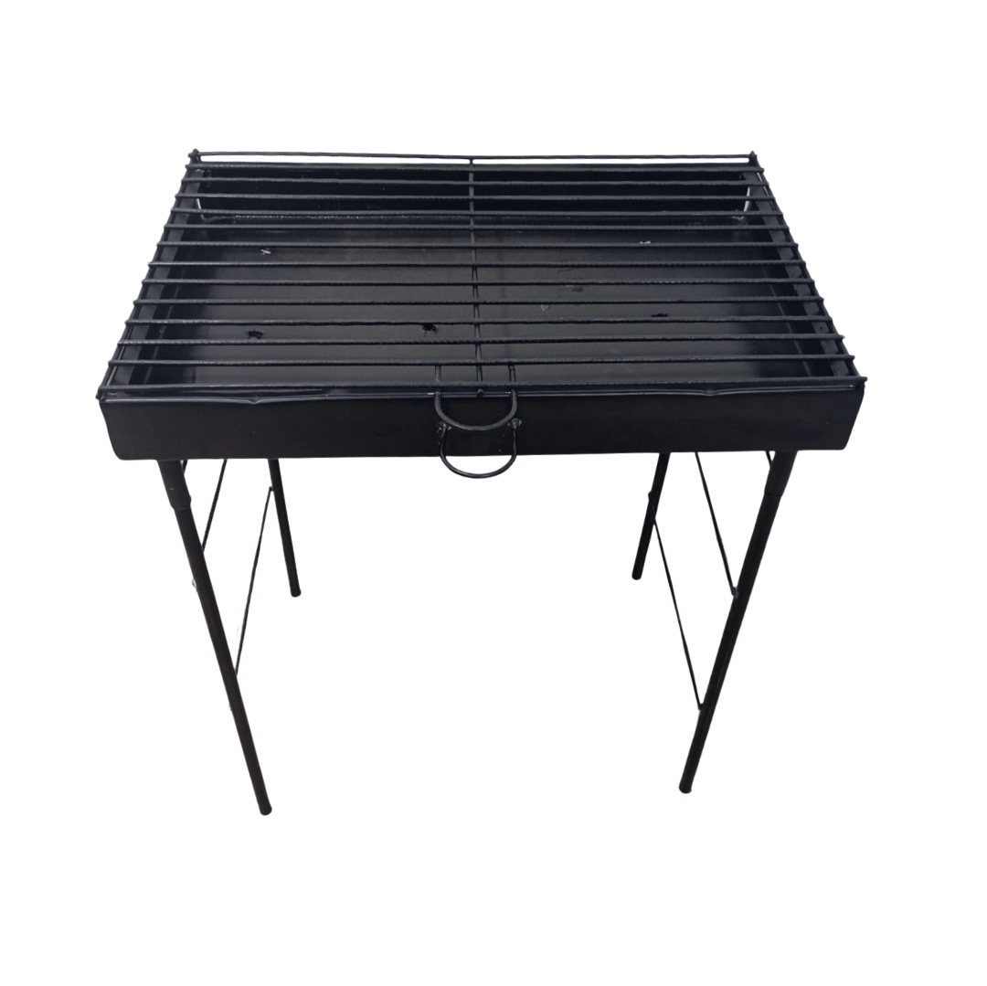 Parrilla de carbón metálica, compacta y práctica, ideal para asados al aire libre, terrazas o campamentos.