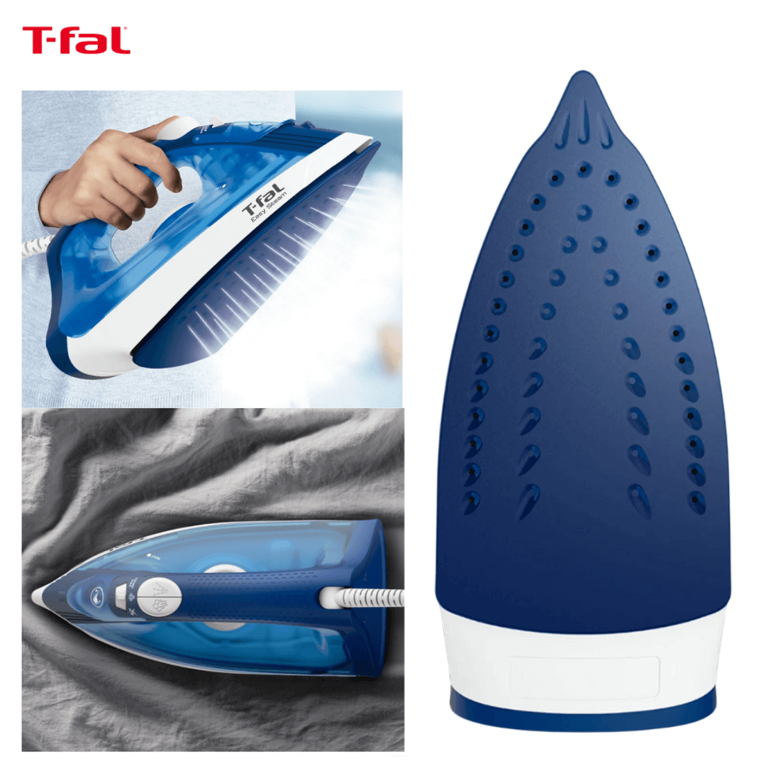 PLANCHA EASY STEAM ANTIADHERENTE T-FAL REF: 1830007772; plancha de vapor portátil fabricada en plástico resistente con suela antiadherente Duraglide, en color azul, con dimensiones de 13 cm de alto, 30 cm de ancho y 16 cm de largo. Pertenece a la marca T-FAL, sin niveles ni compartimientos, con capacidad de 220 ml en su depósito de agua y potencia de 1.200 W para calentamiento rápido. Ofrece vapor continuo de 20 g/min y cobertura amplia gracias a su suela XL, ideal para eliminar arrugas en prendas de todo tipo. Recomendada para uso en lavandería o hogar, se sugiere emplearla sobre superficies firmes, llenar el tanque con agua limpia, activar el vapor según el tipo de tejido, limpiar la suela después de cada uso y vaciar el depósito para prolongar su vida útil.