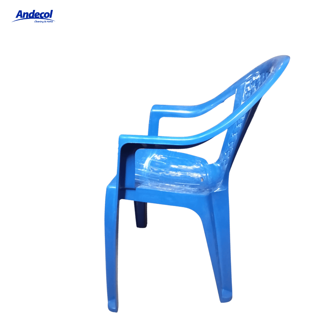 SILLA  EPIKA ADULTO AZUL PELETIZADA CON BRAZO ; fabricada en plástico de alta calidad en polipropileno, con dimensiones de 80 cm de alto, 54 cm de ancho y 39 cm de largo. Presenta un diseño apoya brazo monoblock sin niveles ni compartimientos, con capacidad para una persona adulta y estructura tipo tejido maya que mejora la ventilación y comodidad. Su color AZUL  aporta un toque moderno y vibrante y sofisticado, ideal para uso en interiores o exteriores como terrazas, patios, jardines, balcones o áreas sociales. Es ligera, resistente a la intemperie y fácil de limpiar; se recomienda lavar con agua y jabón suave, evitar sobrecargarla y conservarla en superficies firmes para mayor estabilidad y durabilidad.