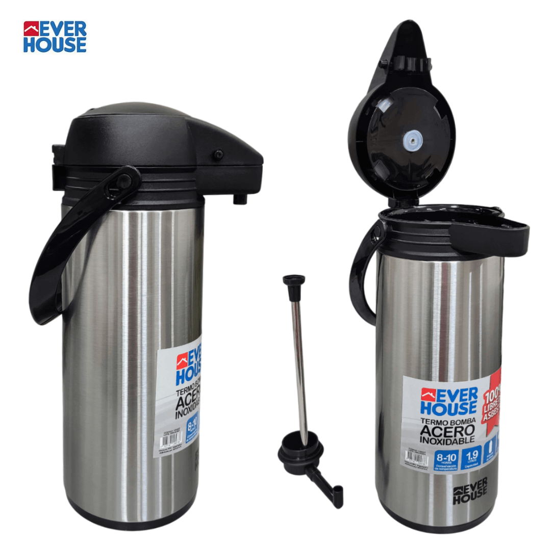 TERMO BOMBA ACERO INOX EVER HOUSE 1.9 LTS REF 107484; Este termo con bomba dispensadora de 1.9 litros es ideal para mantener tus bebidas calientes o frías durante varias horas. Fabricado en acero inoxidable de alta calidad, combina durabilidad, elegancia y funcionalidad. Su bomba tipo émbolo permite servir con facilidad y sin derrames, lo que lo hace perfecto para reuniones familiares, oficinas, cafeterías, eventos o uso diario en el hogar.