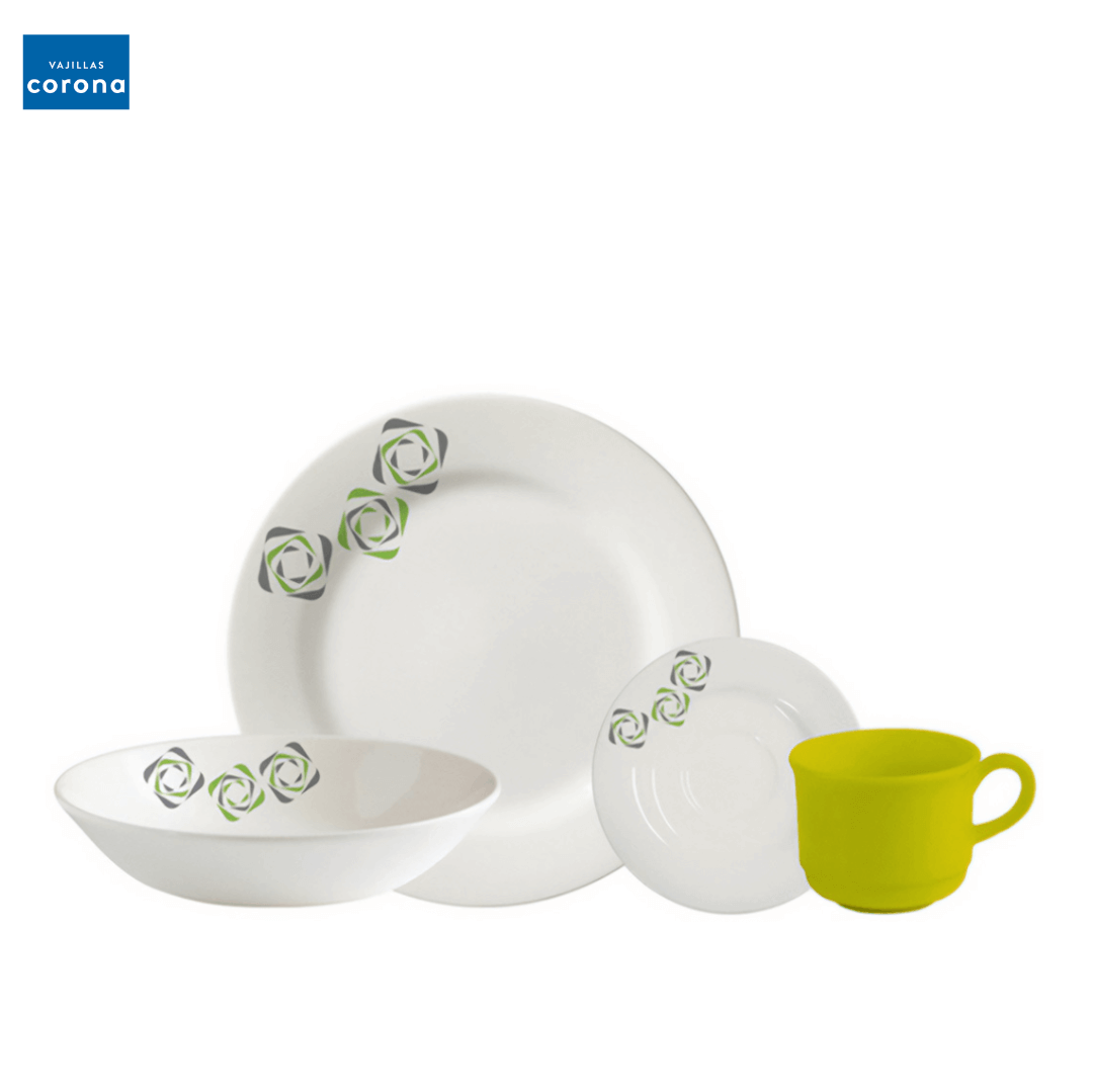 VAJILLA CORONA BORJA 4 PTOS 16 PCS REF VL12900403; en color blanco con diseño artístico multicolor, marca Corona, compuesto por 16 piezas distribuidas en 4 platos llanos, 4 platos hondos, 4 platos de postre y 4 pocillos, Este tipo de producto es no desarmable, ideal para uso diario en la cocina y áreas de comedor. Fabricado en cerámica vitrificada, ofrece gran durabilidad, es apto para microondas y lavaplatos, y su material no es perjudicial para la salud al cumplir con normas de plomo y cadmio. Se recomienda evitar temperaturas superiores a 75 °C