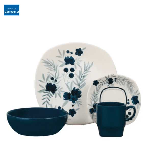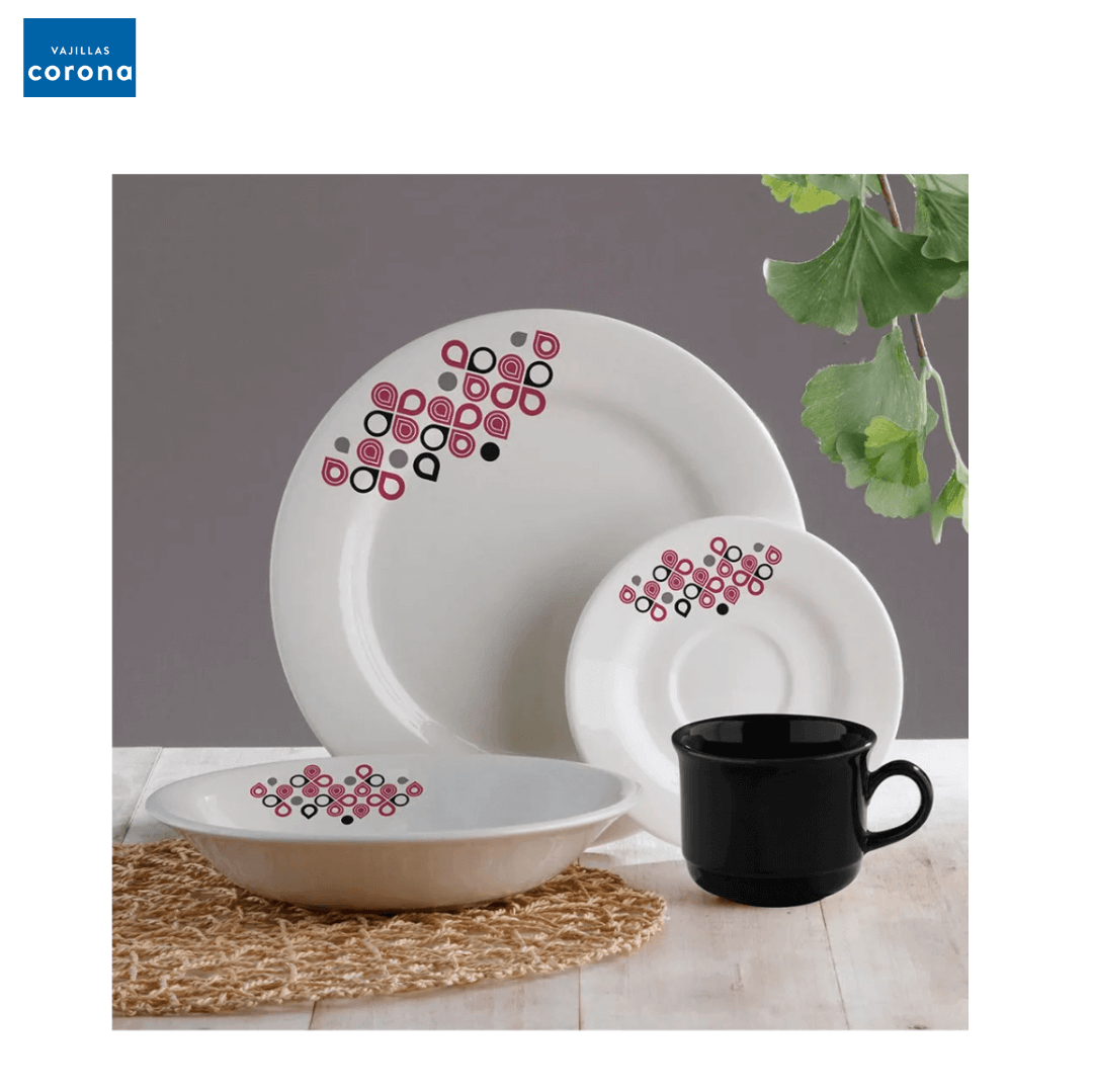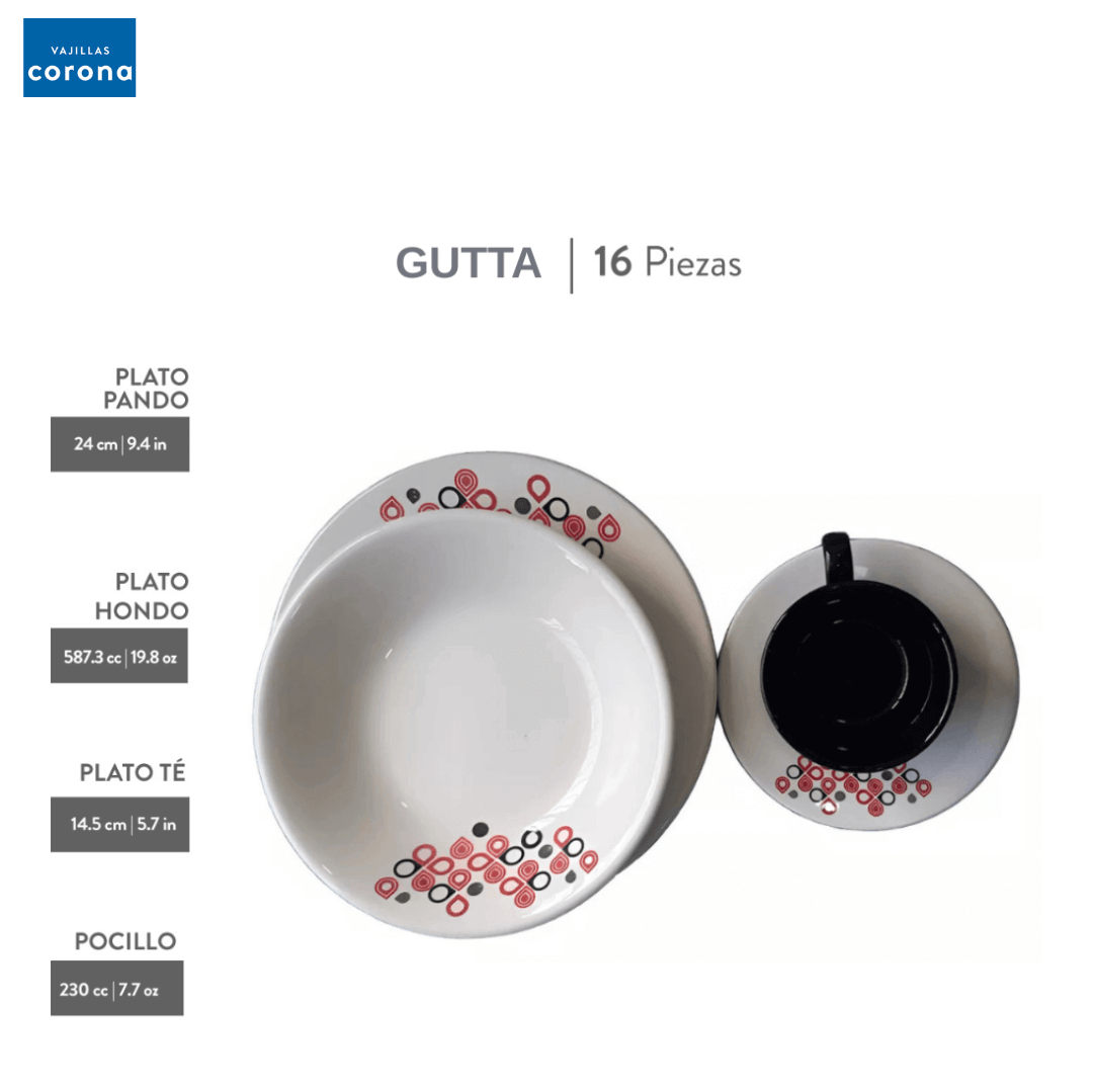 VAJILLA CORONA GUTTA 4 PTOS 16 PCS REF VL186E0402; juego funcional y decorativo elaborado en cerámica de alta resistencia, con dimensiones aproximadas del empaque de 15 cm de alto, 31.5 cm de ancho y 25 cm de largo, en color blanco con diseño artístico multicolor, marca Corona, compuesto por 16 piezas distribuidas en 4 platos llanos, 4 platos hondos, 4 platos de postre y 4 pocillos, Este tipo de producto es no desarmable, ideal para uso diario en la cocina y áreas de comedor. Fabricado en cerámica vitrificada, ofrece gran durabilidad, es apto para microondas y lavaplatos, y su material no es perjudicial para la salud al cumplir con normas de plomo y cadmio. Se recomienda evitar temperaturas superiores a 75 °C