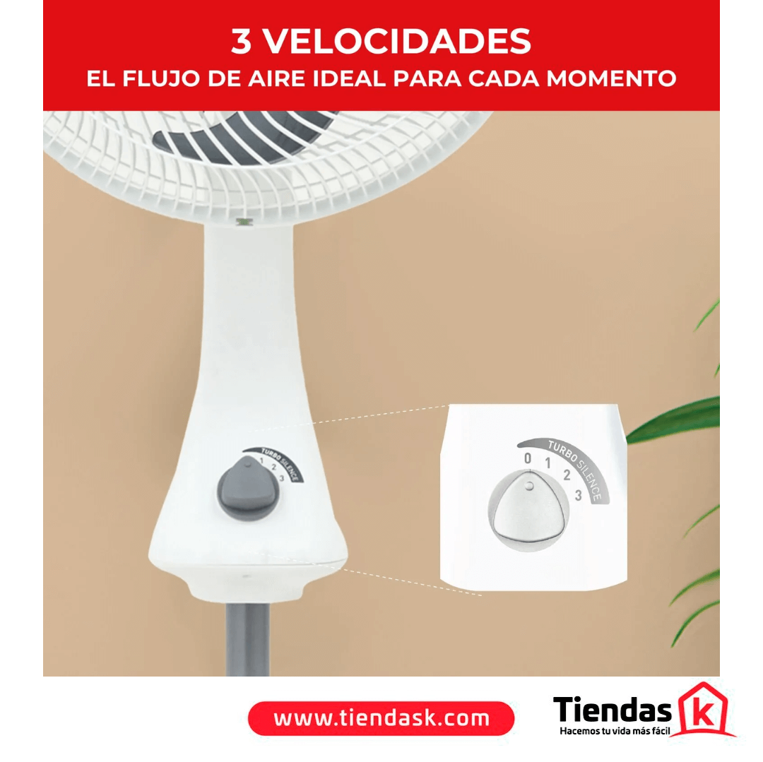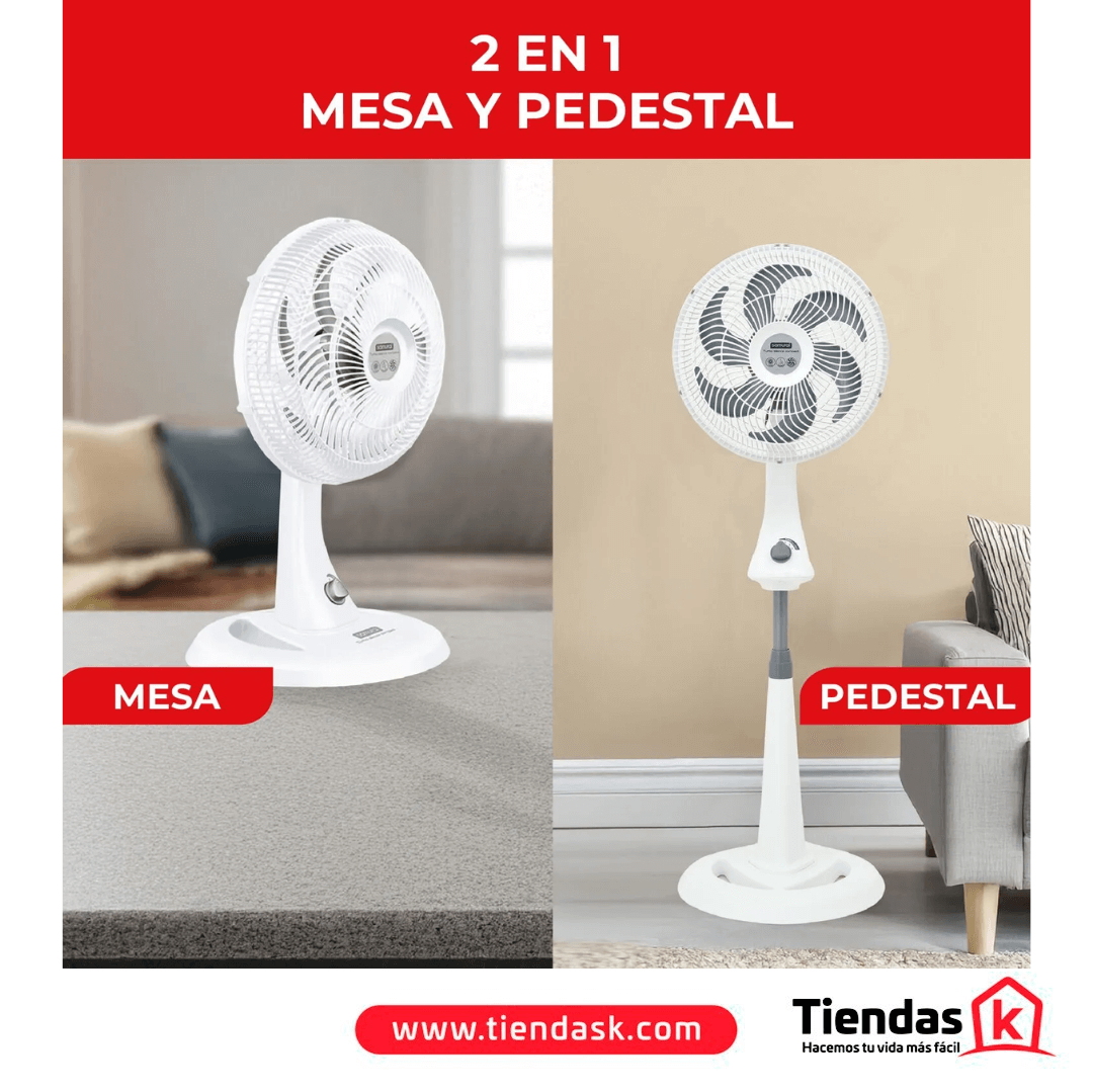VENTILADOR TURBO SILENCE 2 EN 1 14 PULGADAS 6 ASPAS BLANCO REF 5861024454; un modelo versátil que funciona como ventilador de mesa o pedestal, fabricado en materiales plásticos de alta resistencia y motor compacto de bajo ruido. Cuenta con dimensiones aproximadas de 26 cm de alto, 49 cm de ancho y 41 cm de largo, color blanco y marca Samurai. Incorpora 3 velocidades, sistema de oscilación, inclinación vertical regulable y diseño de 6 aspas que optimizan el flujo de aire. Ideal para usar en habitaciones, oficinas o salas, permitiendo ajustar su altura y ubicación según la necesidad, brindando un ambiente fresco con operación silenciosa y eficiente